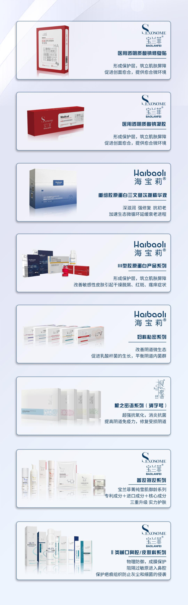 宝兰菲BAOLANFEI,秉承“匠心缔造美丽”理念,以外泌体细胞再生美学护肤为产品核心,打造年轻态肌肤。 海宝莉Haibaoll,专研成分,力塑婴儿般肌肤,用“成分可查,效果可见”的创新理念打造**护肤品。 2015年,集团研发团队取得突破,研发出核心专利成分牡丹肽富勒烯(专利号CN201910274000.3),针对皮肤暗沉、衰老、敏感等肌肤问题提供全方位治疗方案。强大的阻黑修护功效,为肌肤焕然新生提供源动力。同时,具有术后不红肿、修复期短见效快、维持时间长等优势。继而推出富勒烯系列自主化妆品牌,并且申请注册商标“富勒烯”。 富勒烯FUEPENE,深耕全层美白、多维净斑、科技美肤,致力为广大爱美之士提供高端医学美容护肤品。系列产品于全国各大美容、医疗院线备受热捧,单品面膜年销量超7000万片,以品质打响口碑! 此外,还有院线高端畅销品牌海缇泉,诗贝尔、艾缇姿,以及自主研发妇科私密品牌孕芙美、根之密语。 集团研发生产产品包括Ⅲ类械、Ⅱ类械字号三型胶原蛋白系列、外泌体系列、普妆特妆系列、妇科私密系列、口服排毒系列、富勒烯系列等,涵盖妆、消、食、械字号,形成横向扩展健康相关产业跨界、纵向整合产业链的商业模式。